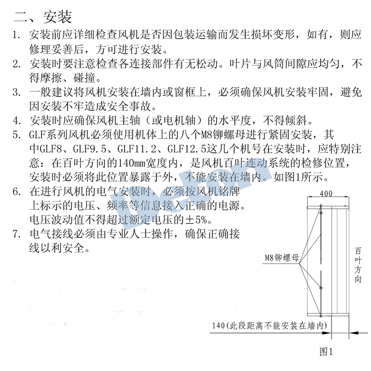 注意事項:風機安裝時應注意風機的水平位置,調(diào)整到風機與地面水平穩(wěn)固。安裝后電機不可有傾斜現(xiàn)象